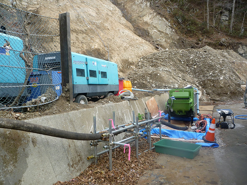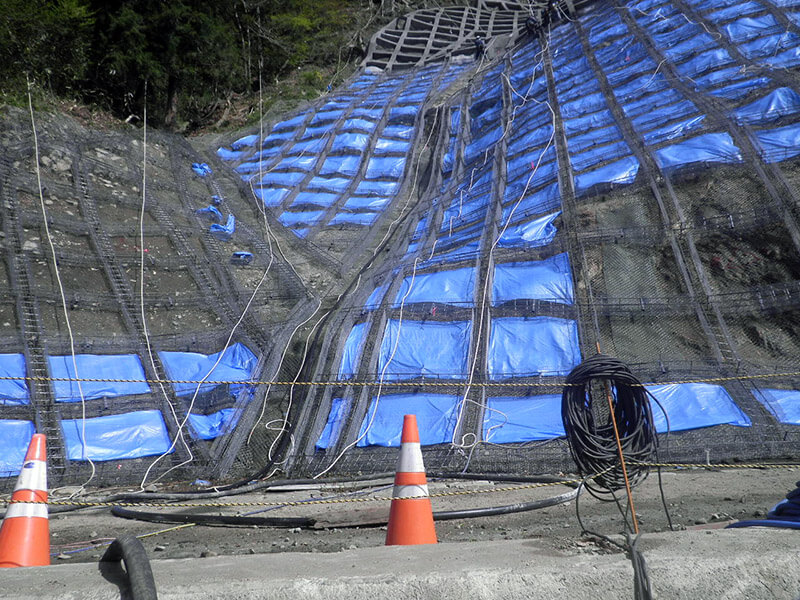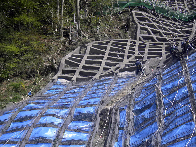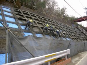 セメントと砂と水を混合したモルタルを圧縮空気によって、吹付けし、法枠を造ります。枠の中の青いシートは後々緑化をするので、モルタルが付かないように養生の役目をしています。