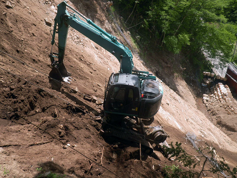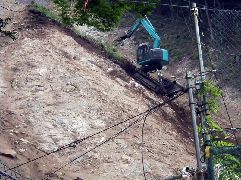 高所法面の切取り・切崩し・掘削、整形、抜根などの作業を行ないます。
